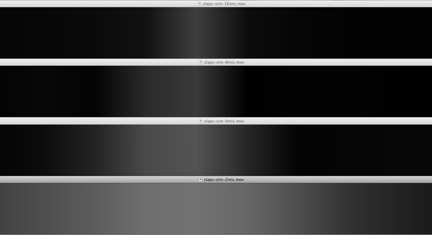 Following are 4 animations all frozen on a frame showing the beginning of a hand-clap, located just slightly left of center relative to the array’s forward direction. I simulated it for 2-, 4-, 8-, and 16 mics to demonstrate just how much more directional it gets as you increase the number of mics. Four mics is a very small array, but it is enough to prove out our code. The current results of the 4-mic array actually closer resemble the 2-mic simulated data unfortunately, but we hope to improve on this with better process.