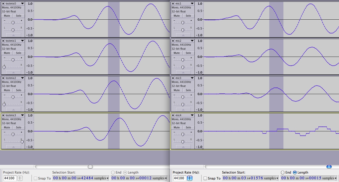 Following is a picture of 4 waveforms (left side) of my simulation, and 4 waveforms (right side) of actual recorded array data. In the “real” data you will notice the near-field effects which show up as mismatch in the amplitudes between the mics. You will also see channel 4, which had its gain set way too low. Currently my code doesn’t model sound attenuation with distance so it will work better with far-field sounds.