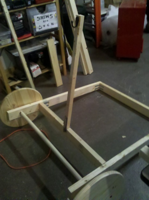Sean started with a simple sketch to feel out the details of what needed to be in the apparatus. PJ and his friend Bob helped with figuring out the technical details and labor of construction. The project came in three parts, the Cart, the Torso, and the Head.