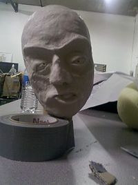 And the face was formed with modelling clay around a craft mask blank. The major facial features are first shaped with rolls of clay, then rolled-out sheets of clay are overlapped and blended to make “skin”. Finally, strips of tissue paper are cemented on top of the clay to give it strength as it dries out and to give the skin a dried, dead look.