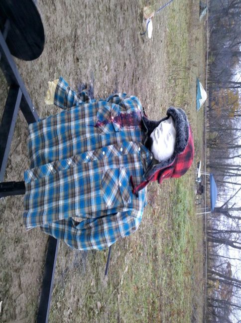 And here is the completed dummy. Kerosene was used as an accelerant for the burn. Kerosene is much safer than gasoline or alcohol to burn in the open, as kerosene vapor does not explode like gasoline or alcohol. While the kerosene was somewhat difficult to procure (not all gasoline stations carry it) and was marginally difficult to start burning without special arrangements (a cigarette lighter proved insufficient), the safety issues were more than worth it. During the shoot, all activity outside of the burn area was stopped, with three people on fire extinguisher duty. With proper planning, a little practice, and completely professional attitudes on everyone’s behalf, the shoot went off without a hitch and the burn was controlled safely. Hurrah!